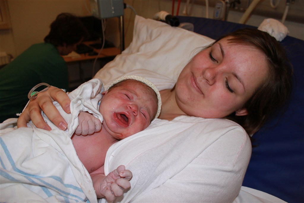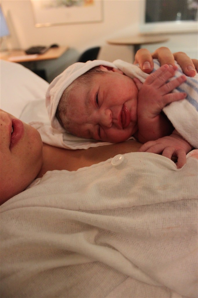 Jeg pressede heller ikke aktivt med mere end et par minutter - altså en presseve, hvor hovedet kom ud + en hvor resten af kroppen kom ud. Resten af pressefasen lod jeg bare kroppen gøre arbejdet. Jeg tror, der står noget med, at jeg presser med fra kl. 19.57, og han er jo født kl. 19.59. Men altså de der to minutter - det føltes som to dage!