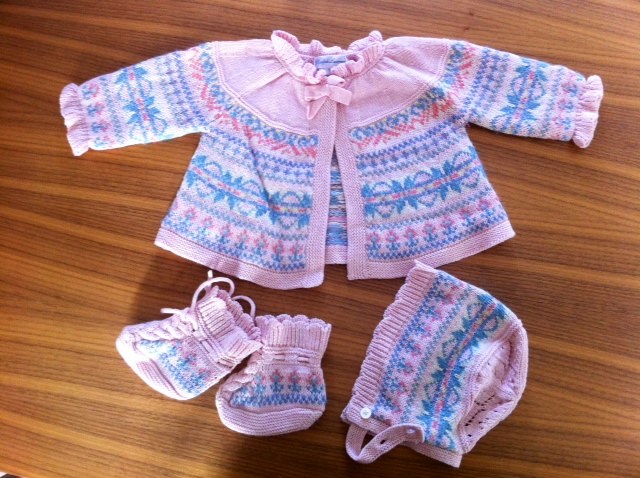 SKØNT Ralph Lauren strik sæt til baby bestående af fødder, cardigan og hue. 100% bomuld. Nyprisen var 1750kr.