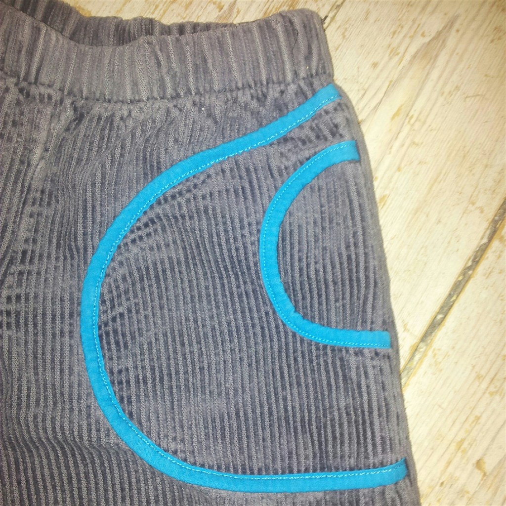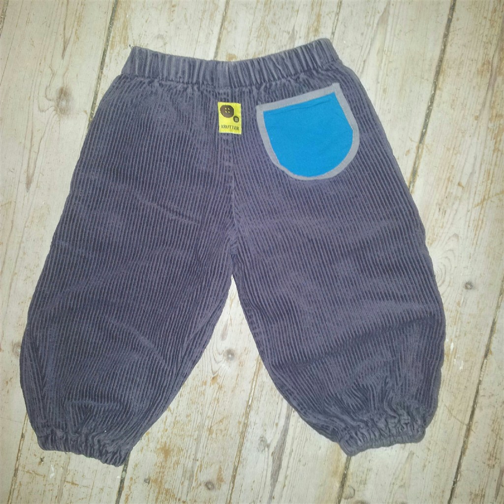 Lækre Krutter bukser i grå fløjl i kraftig kvalitet med scooter-motiv foran og fine forlommer med blå kant samt en lille blå baglomme.