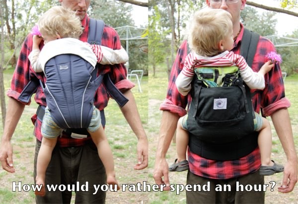 Derudover vil jeg aldrig nogensinde anbefale at man bærer en baby fremadvendt. Det er alt for mange indtryk og baby har ingen mulighed for at skærme sig fra det hele. Det er MEGET sundere at lade baby sidde med fronten mod bæreren og kigge ud til siden. De kan på den måde se rigeligt men kan samtidig vende hovedet væk når de har behov for det.