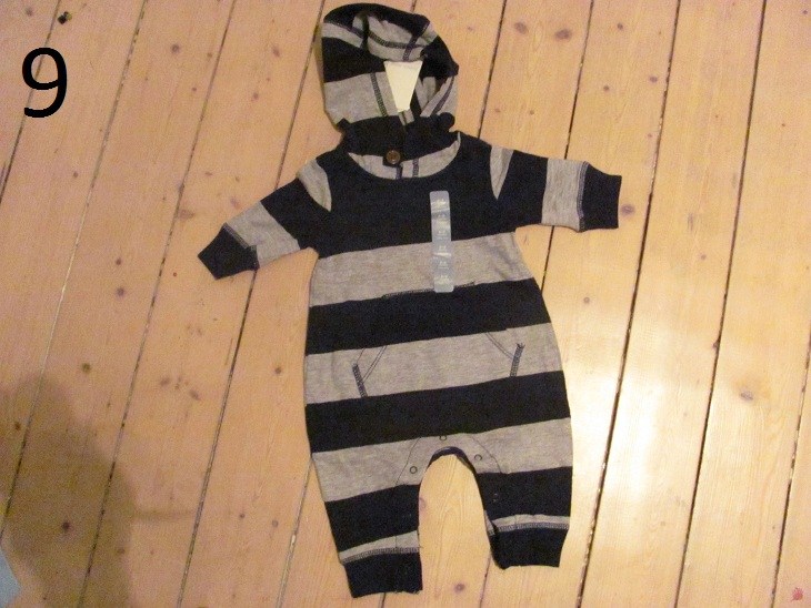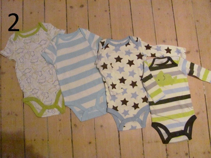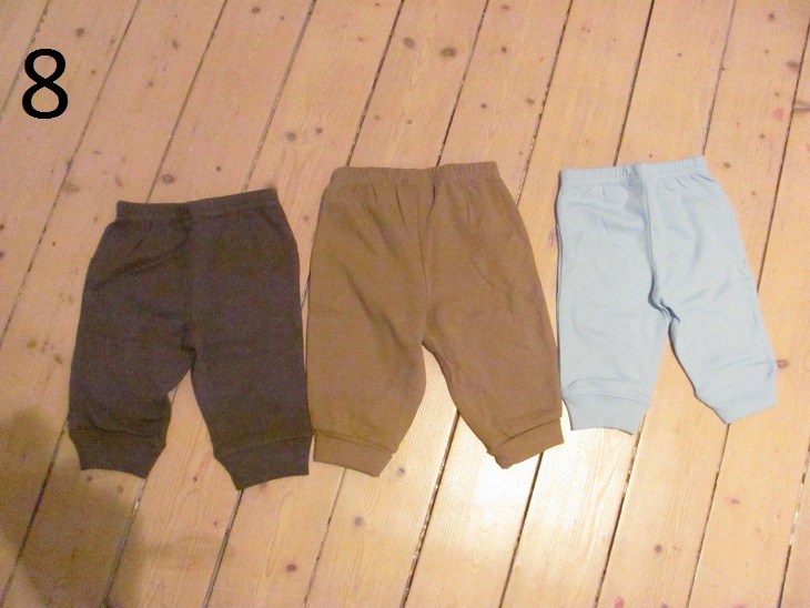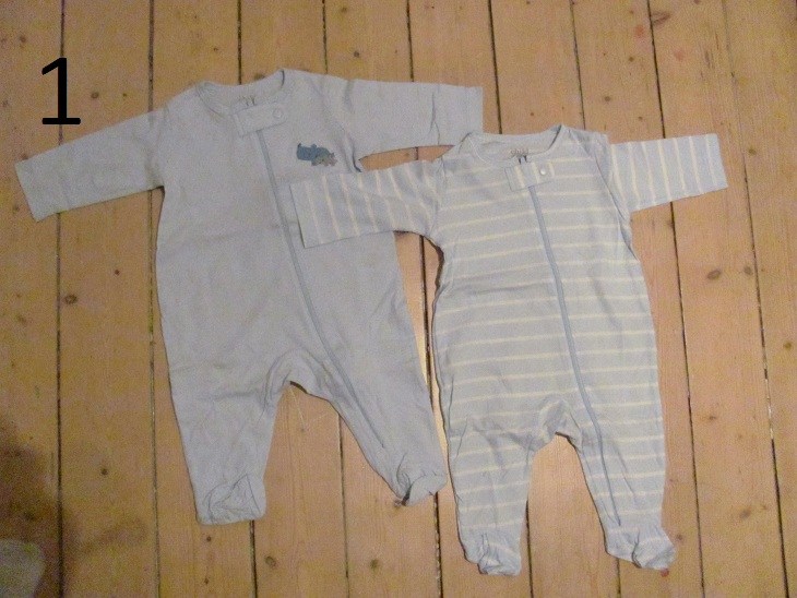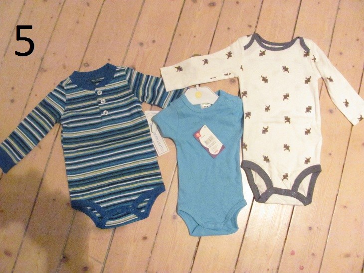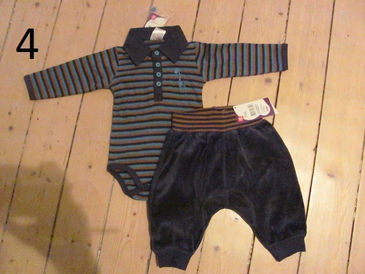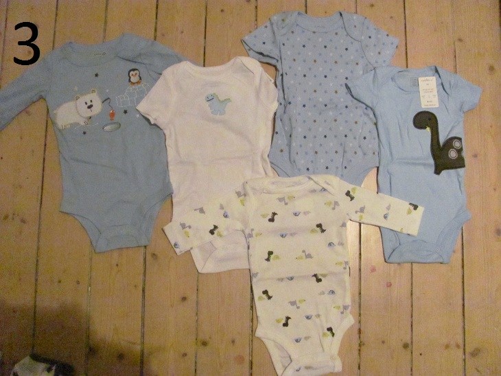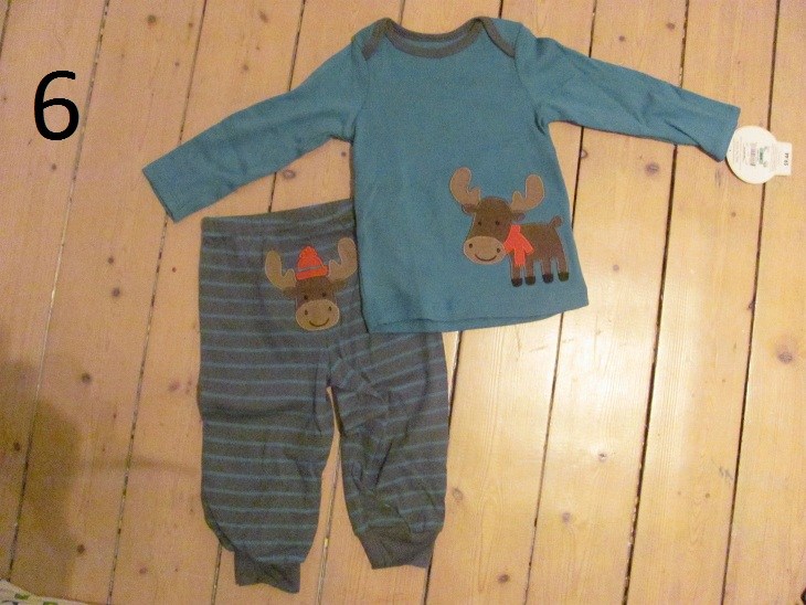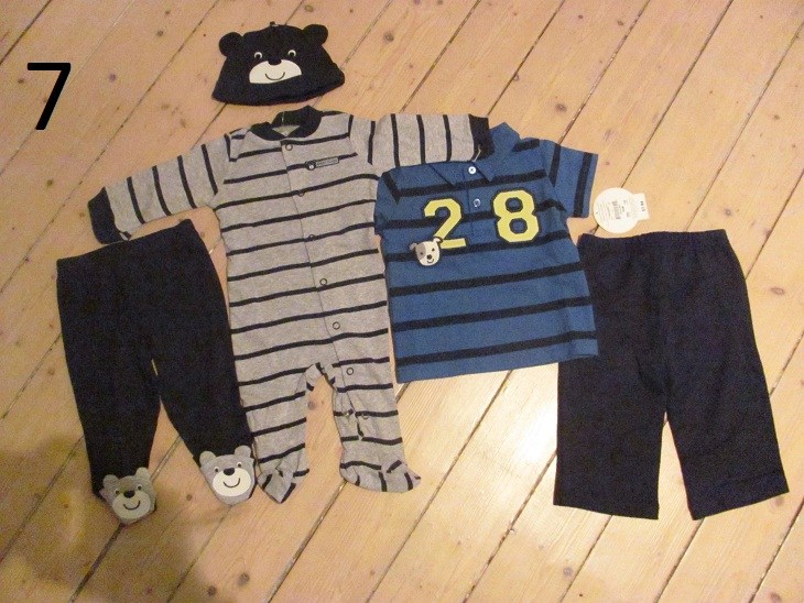 Har fået afsat den de første to bodyer (fra venstre side) på billede 3, den hvide body med elge på billede 5, tøjet på billede 6 samt t-shirten og bukserne (i højre side) på billede 7.