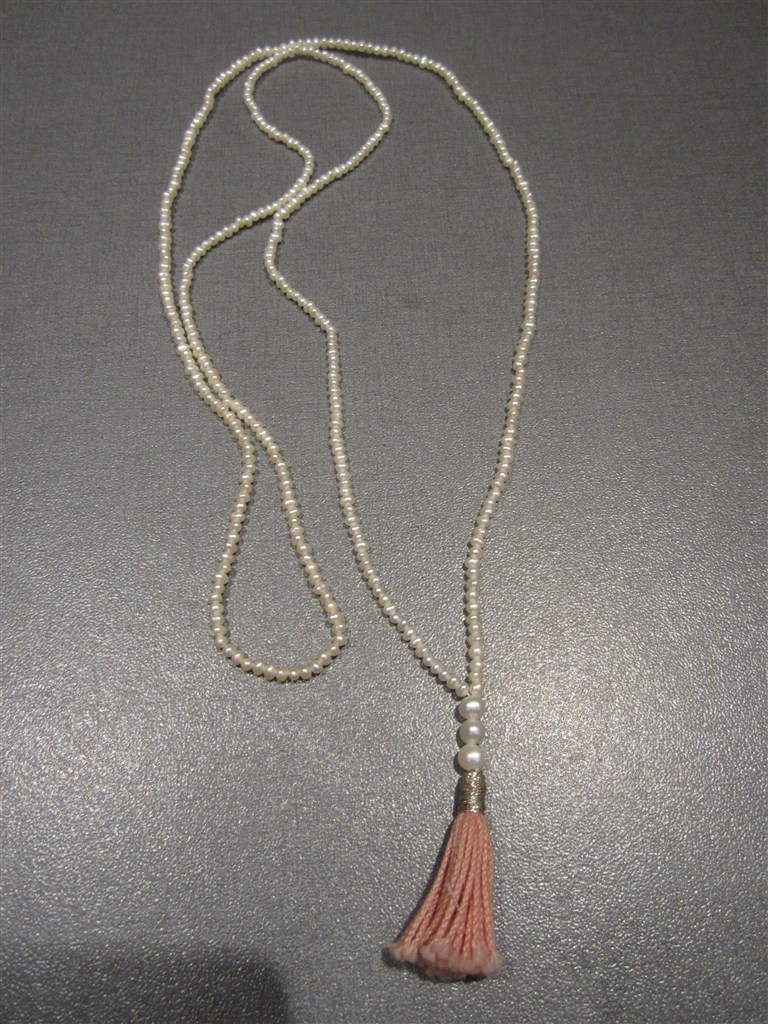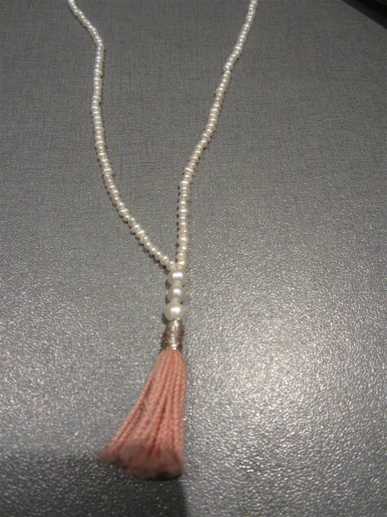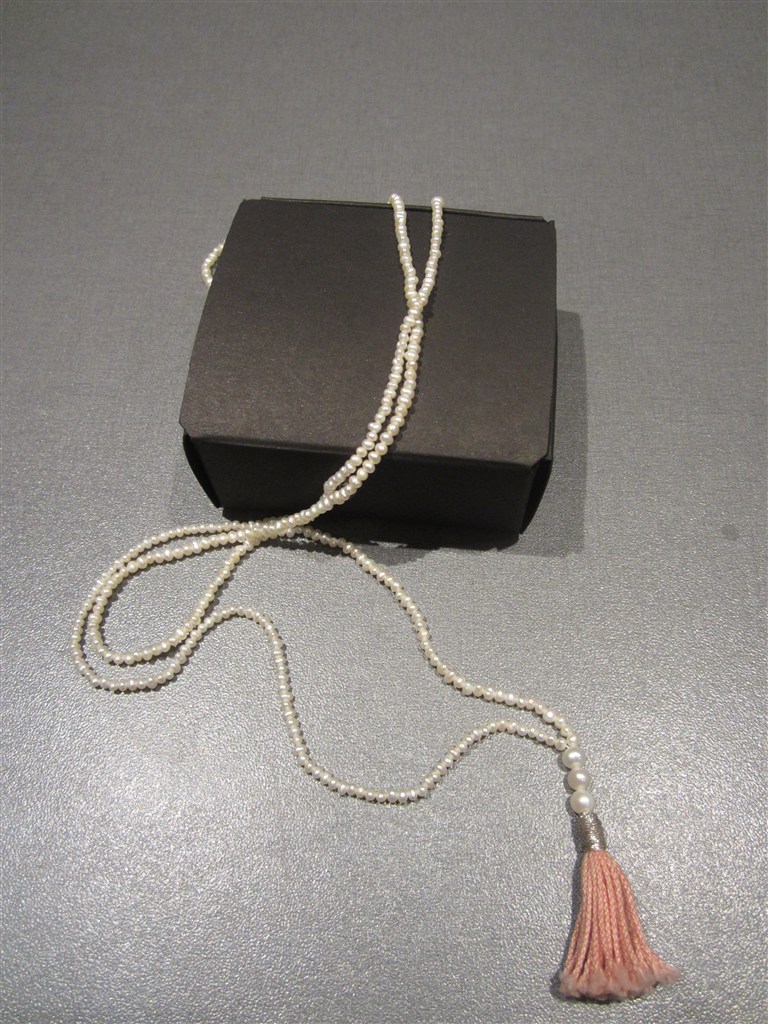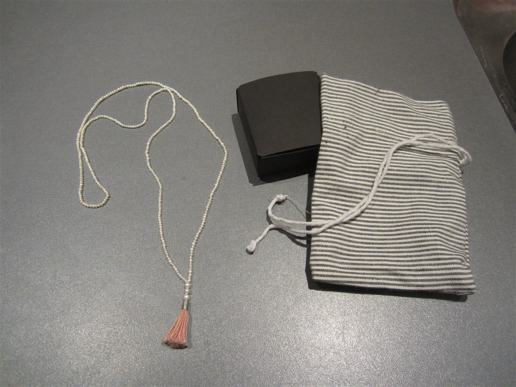 Jeg har her en oplagt julegave mulighed. En perlekæde fra designeren Jane König med en lyserød snor. Der medfølger æske og smykkepose.