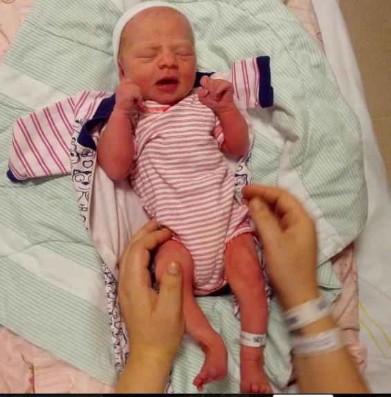 Jeg bliver lagt i sengen og får bukseren af, og min jordemor kigger meget forundret på mig og siger "hold da kæft, hendes hoved er jo lige der" Hun beder min mand om at trække i snoren da det kun er hende, min mand og jeg på fødestuen, jeg når at presse 2 gange og vupti så er hun ude, imens formår min mand at hive snoren ud af væggen i ren frustrasion over der ikke kommer nogen, og min jordemor må alene tage imod lille pigen. Hun er født kl 16.54 så på under 25min, åbende jeg mig 8 cm og fødte min dejligt lille datter