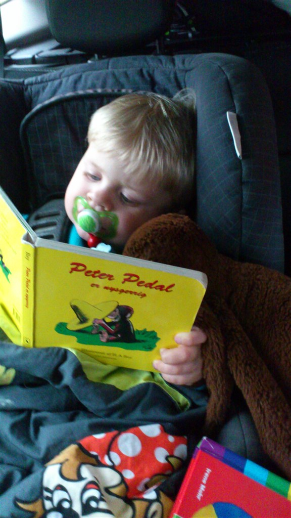 Der kommer hele tiden flere ord til og lige nu er det helt store fulge ("pooop pooop"), "bil" og "bog"! Han siger også ofte "prøv at se", "hoooov" og "av av av" - nok efter sin mor!