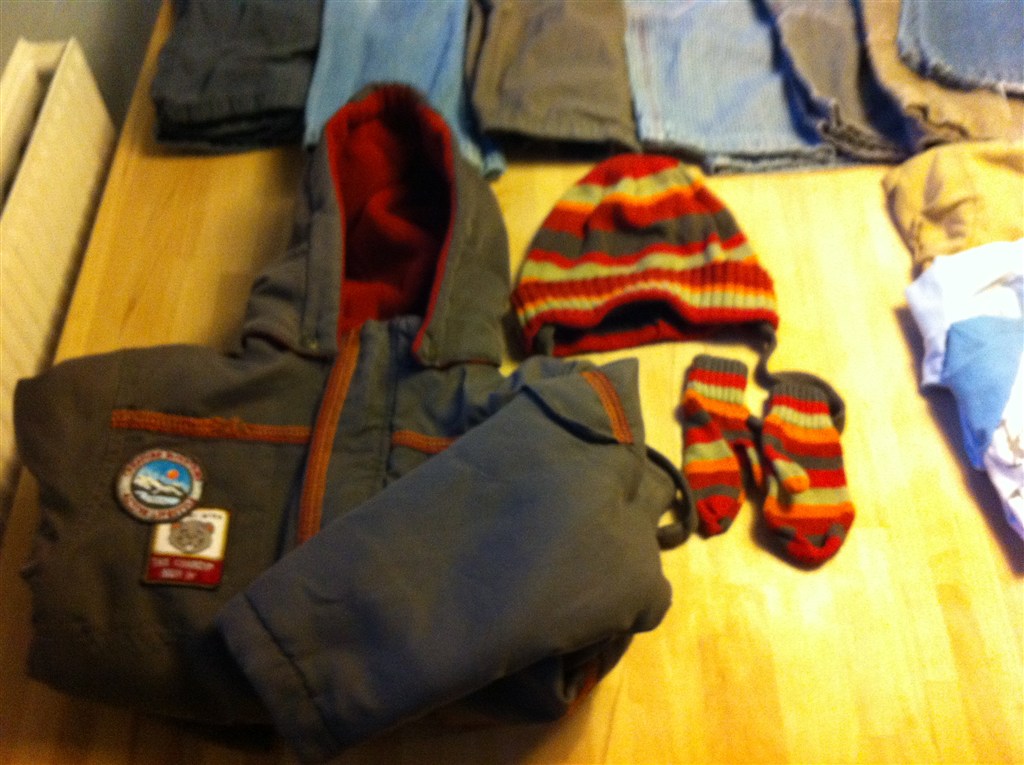 Indeholder:1 Overgangs-/vinterjakke1 hue1 sæt vanter1 fleece1 par shorts3 tanktops2 sæt nattøj