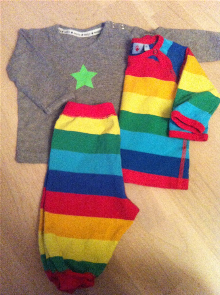 29. bluse+bluse+buks, molo grå str. 62/68, regnbue str.68, buks str.62 velholdt