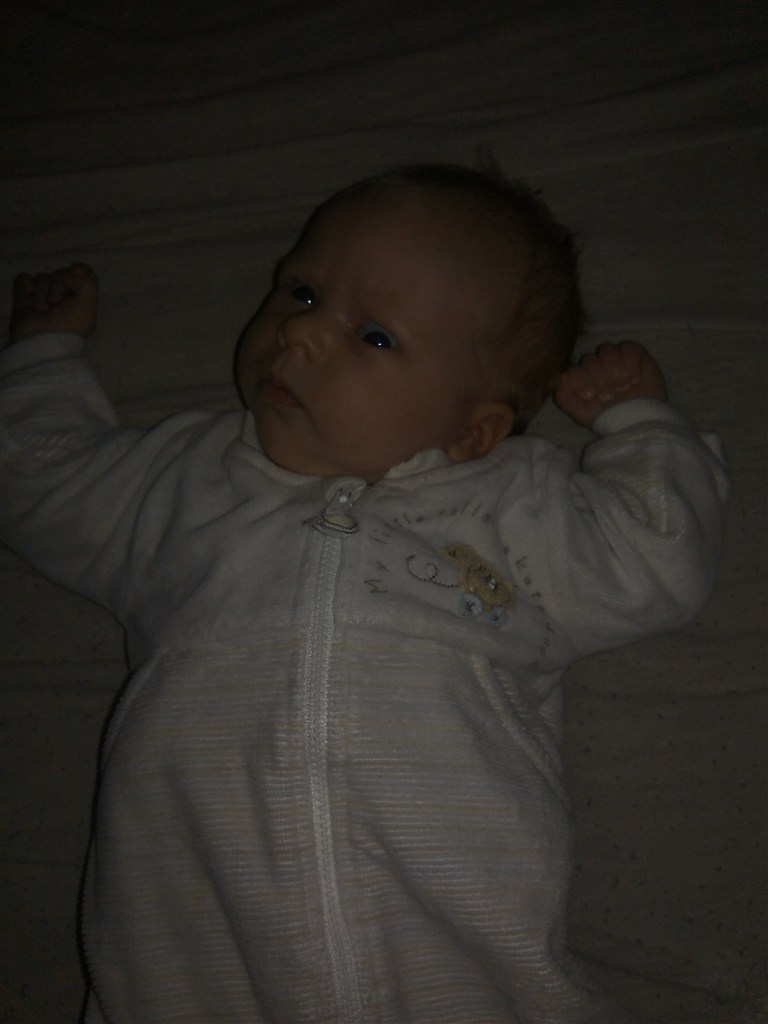 Her går det fint: Daimi er skøn - hun trives og bliver bare mere og mere lækker. Amningen går rigtig godt nu, heldigvis, efter de første ugers smertehelvede. Der er stadigvæk ikke noget der minder om en rytme, hverken med mad, søvn eller andet, men pyt - hun får lov til at styre sagerne... Hun bliver ofte lidt urolig når hun har spist, og har svært ved at få bøvset ordentligt. Så vrider hun sig og bliver ked af det, og efter noget tid slår hun nogle ordentlige prutter. Det er synd for hende, for det gør ondt, men der er ikke noget af det vi har prøvet at gøre for hende, der virker. Det er heldigvis ikke lang tid af gangen at hun er ked, så det hører til i småtingsafdelingen. Jeg tror måske det skyldes de der D-dråber, men er ikke sikker.