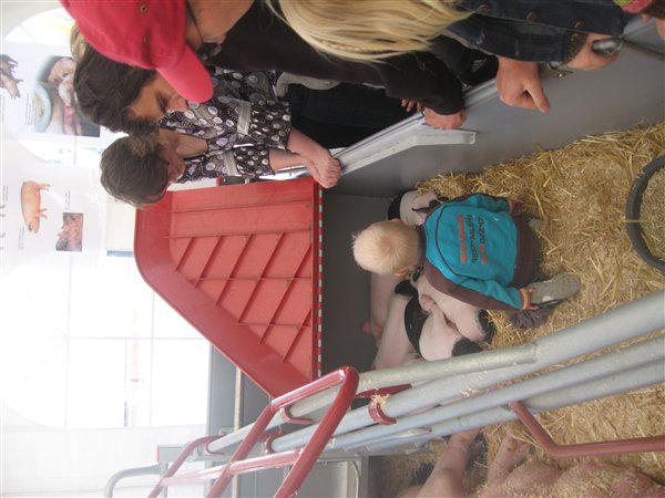 Vi var en tur på landet i weekenden - midt i Aalborg. Dansk Landbrug havde stillet et par traktorer op og lavet en sansesti, der fortalte om hvordan både grise og køer lever på en gård - hvad de spiser, hvad de går i, etc. Og så var de der sørme også selv - køerne og soen med 8 smågrise, der sov. Da vi hev en skrigende William med os faldt bemærkningen: "utroligt de bare sover videre!!"