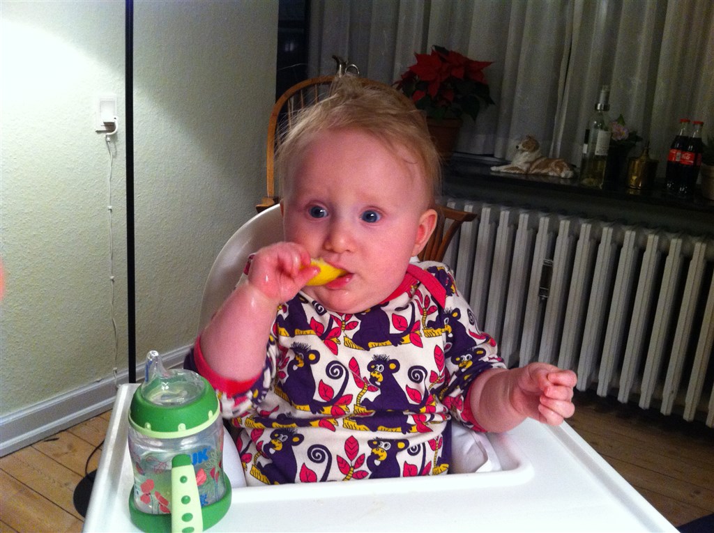 alberte er nu snart 8 mdr, hun er stadig en dejlig mild og nem baby, der gerne vi smage på alt hva vi byder hende. Her spiser/ smager hun citron.