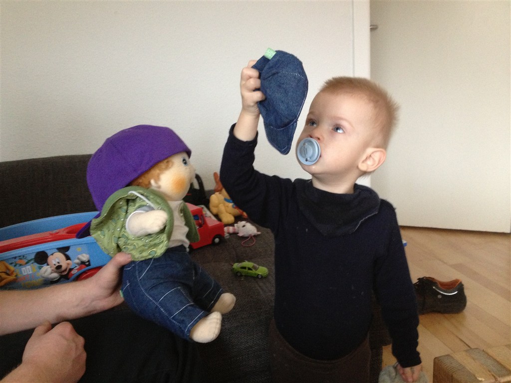 Min lille skat <3 bytter hat med sin dukkedreng. det er så svært at forstå, dukken kan godt få min på, hvorfor kan jeg så ikke få dukkens på?