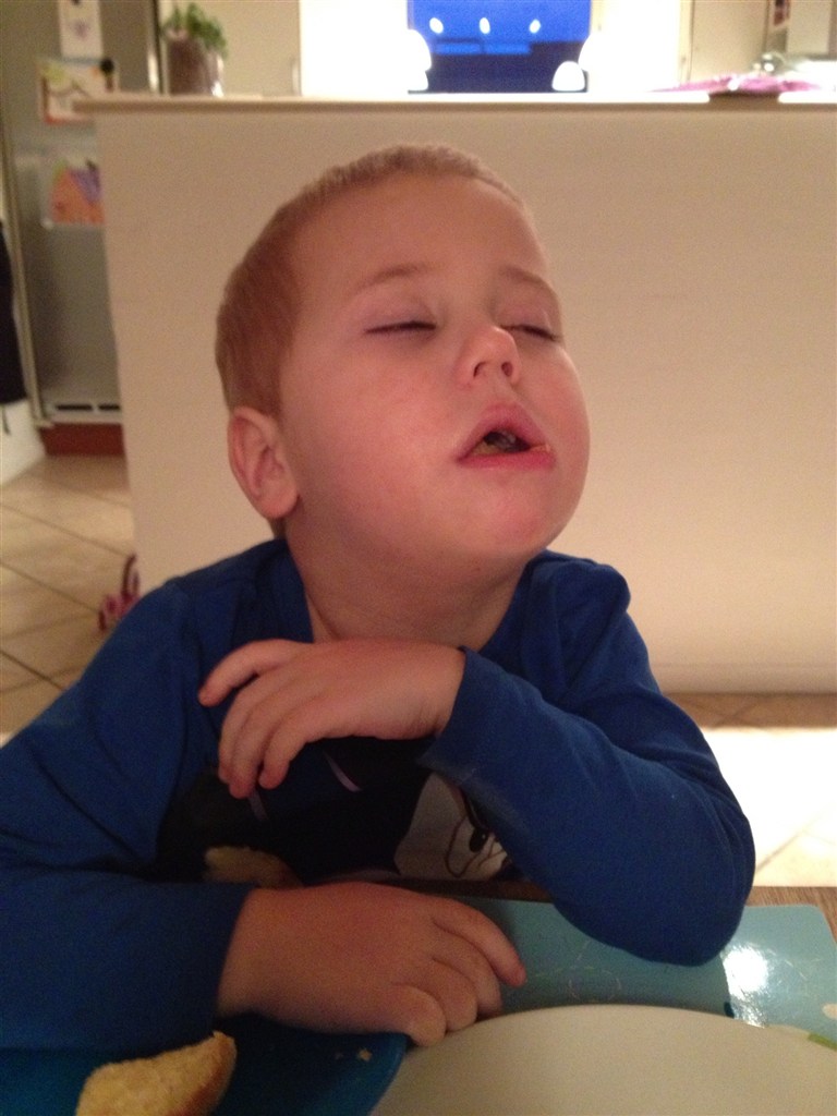 Min søn, der i torsdags kom så træt hjem fra bhv, at han faldt i søvn mens han sad og tyggede en bolle.