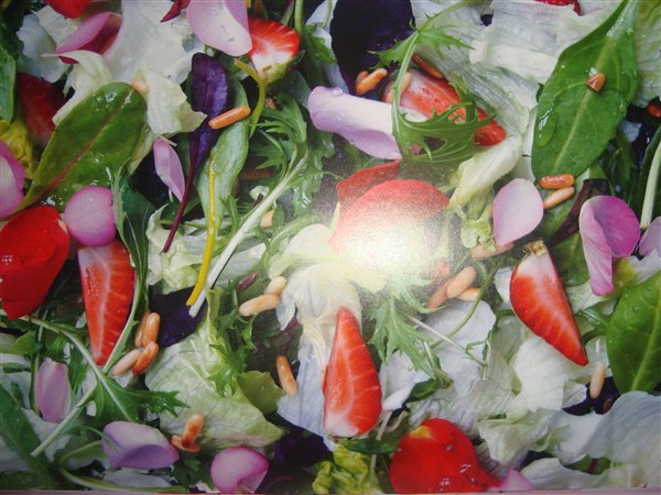 Ved servering: Vend dressing i salaten og fordel den på et fad. Pynt med jordbær, pinjekerner og evt. rosenblade (fra haven uden sprøjtemidler).