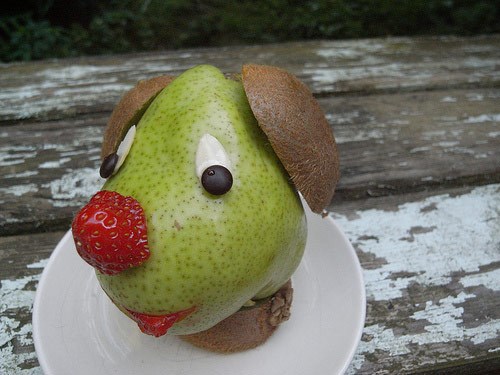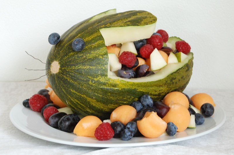 ved der var en herinde der lavede et hajhoved en gang altså med en vandmelon og noget frugt inden i men prøv at søge på "fruit animals" så finder du rigtigt mange på google