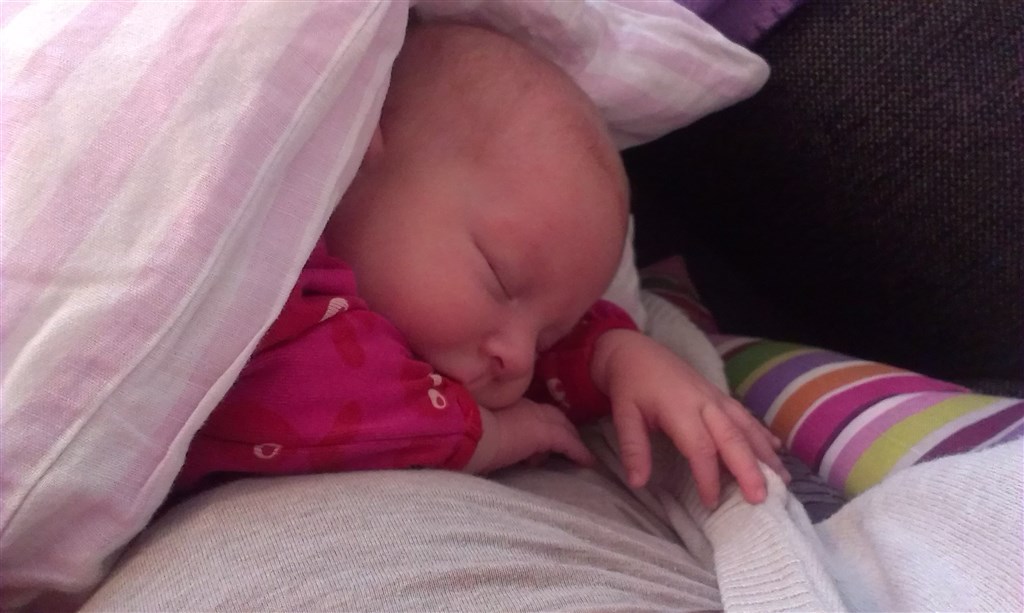 Hun spiser kl 5 og sover gerne videre i mors og/eller fars armhule.