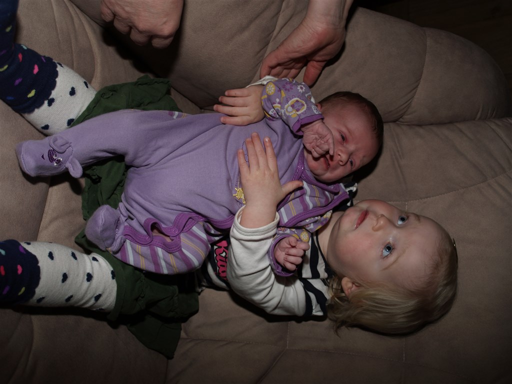 Til sidst, et billede af Anastasia og hendes kusine, den ene 18 måneder, den anden 18 dage og de var så tæt på lige store ved fødselen som de kunne være - 3160 g og 51 cm/3060 og 51 cm, vildt en forskel.