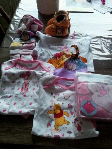 To sutsko med tigerdyr, et med grisling, en sutteklud, sokker og er elle andet jeg ikke lige kan huske hvad hedder.. og så en hue med tigerdyr. Jeg er fuldstændig pjattet med tigerdyr(samler)så hver gang jeg ser noget med ham, så jubler jeg.