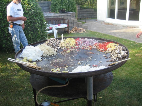 Taaak Line... Ja, fyldte 30 år og holdt fest for lidt over 40 mennesker i lørdags. Med stort telt i haven og vejret kunne ikke have været bedre. Jeg har lige lagt et par billeder ind. Vi havde lånt sådan nogle store pander, lidt a la wok. (jeg glemte bare at tage et billede da den var helt fyldt op...) En masse kød og grønsager rundt i kanten, havde lavet forskellige krydderolier, og så kunne man stå 4-6 stykker rundt om hver og tilberede... Det var mega godt og super hyggeligt.