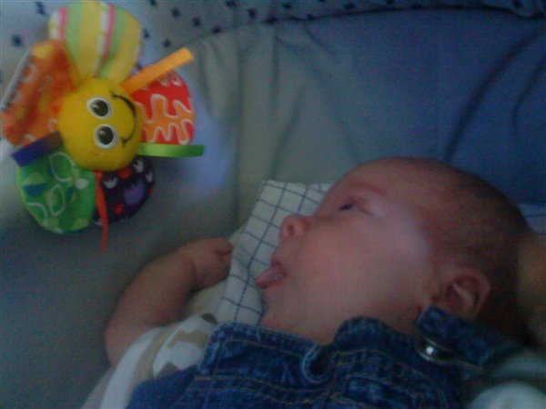Her bliver også rækket(staves) tunge, dog ikke til noget bestemt. Og så har han fundet ud af hvordan han laver bobler og det gør han meget.