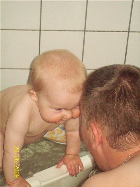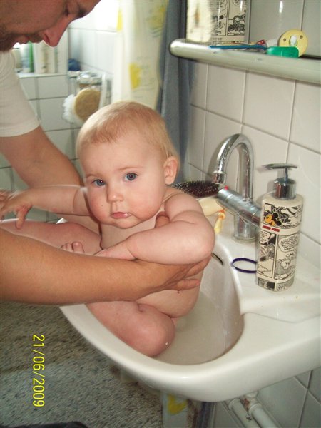 Det i håndvasken, ja hun skulle i bad og havde lige fået ren ble, gæt hvem der så lige havde skidt, så hun skulle jo lige har skyllet numsen inden badet