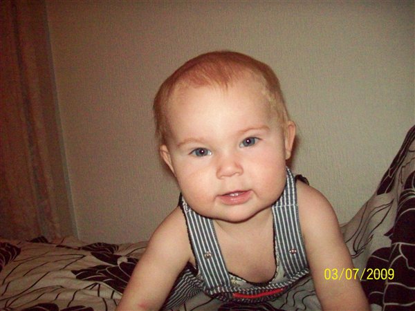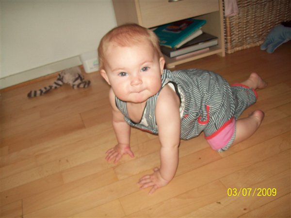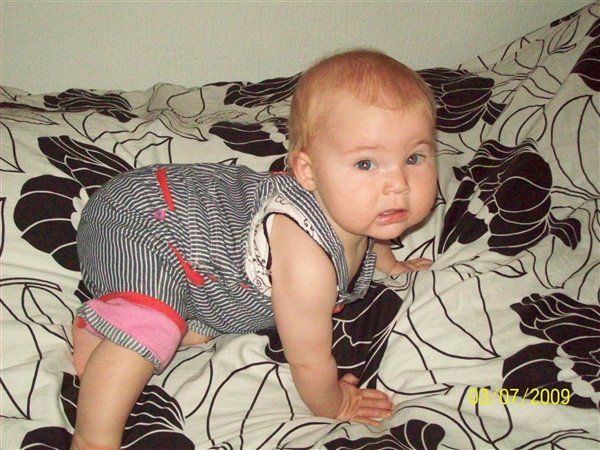 I nat kl. 2. 29 blev min dejlige og skønne datter 11 måneder, ja 11 måneder ja jeg kan bare ikk helt forstå det. Hvor er i himlens navn er de måneder forsvundet hen. Ja i onsdag var der 1 måned til hun holder fødselsdag og i dag er der 1 måned til hun bliver en stor pige på 1 år. UTROLIGT. Ja hun har nu 4 tænder, og nok 2 på vej. Hun går mere og mere sikkert rundt om bordet og vores seng. Hun kravler ikk, hun næsten løber når hun kravler så hurtig går det.Hun kravler op at trappen.Hun siger næsten faaar og mor, mam er jo mad, og hun sagde mad i går.Hun elsker sin vuggestue og der er ingen skrig og skrål når hun bliver afleveret.Hun spiser kun vores mad og er en rigtig madglad pige. Ja når hun kom i vuggestue og der er mad på bordet, ja så kan vi godt gå for hun er "ligeglad" der er mad på bordet. de er nede i vuggestue lidt fasineret over hvor meget hun spiser. Hun sover fint om natten og gerne fra 18.30 -6/7. Varmen lige nu driller hende, men ellers ingen problemer.Hun startede på 4330g og 52 cm lang og nu 11 mdr senere er hun 10200g og 75 cm. Mors store pige. Hun har nogen gange brugt sut. F.eks d. 5 aug 2 dage gammel.