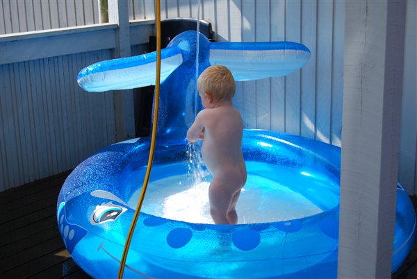 Ja det har jo været varmt men slet ikke rart at løbe rundt i grus i bare føder. og så ser man sådan ud når man er på vej udOg så over og blive kølet af