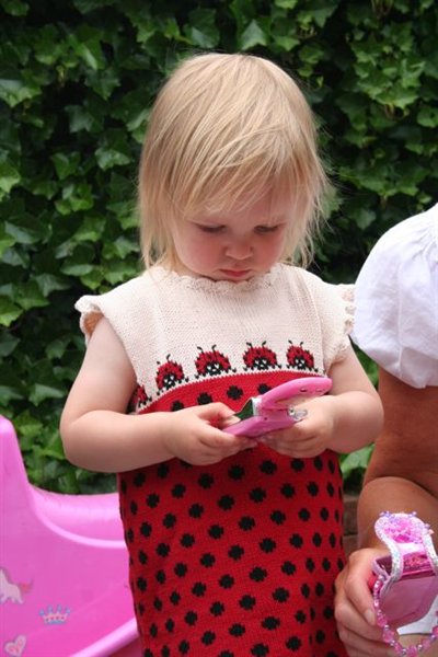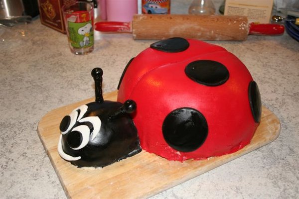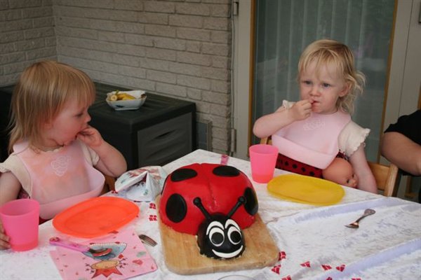 Så var det tid til kage. Pigerne så noget skeptiske ud, da jeg satte mariehønen foran dem. Det var da ikke kage? Tilsidst prøvede de forsigtigt at smage på den. Da de så fik et helt stykke, spiste de løs. Uhm, den var god!