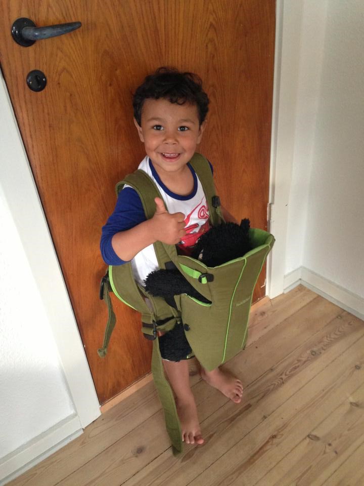 Og jeg skulle jo lige prøve min bære sele, om den stadig passede og sådan, så det ville Oskar jo også