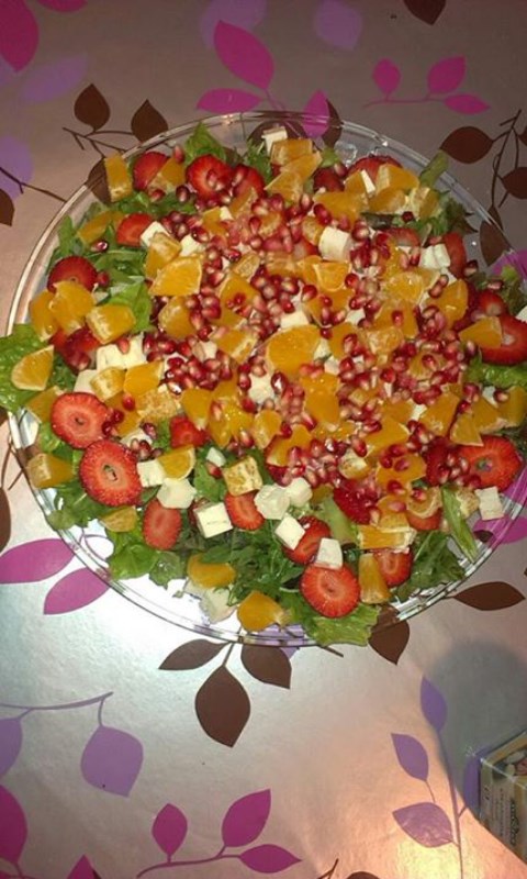 "tomatsalat" men med vandmelon i stedet, løg og feta
