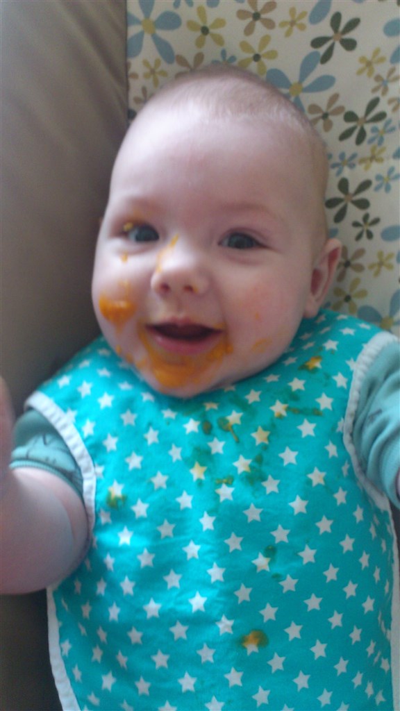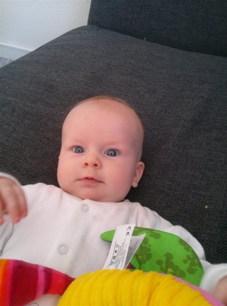 Det med maden er ikke noget vi er kommet ret meget i gang med. Han spiser grød en gang om dagen. Til aften og så får han flaske for resten. Har prøvet at give ham forskellige ting. Men han laver bræklyde og har også kastet noget af det op igen. Så lige nu er det bare grød og nogen gange blandet med grøntsager. Men frugt er han vild med, annanas, melon, æble er et hit.
