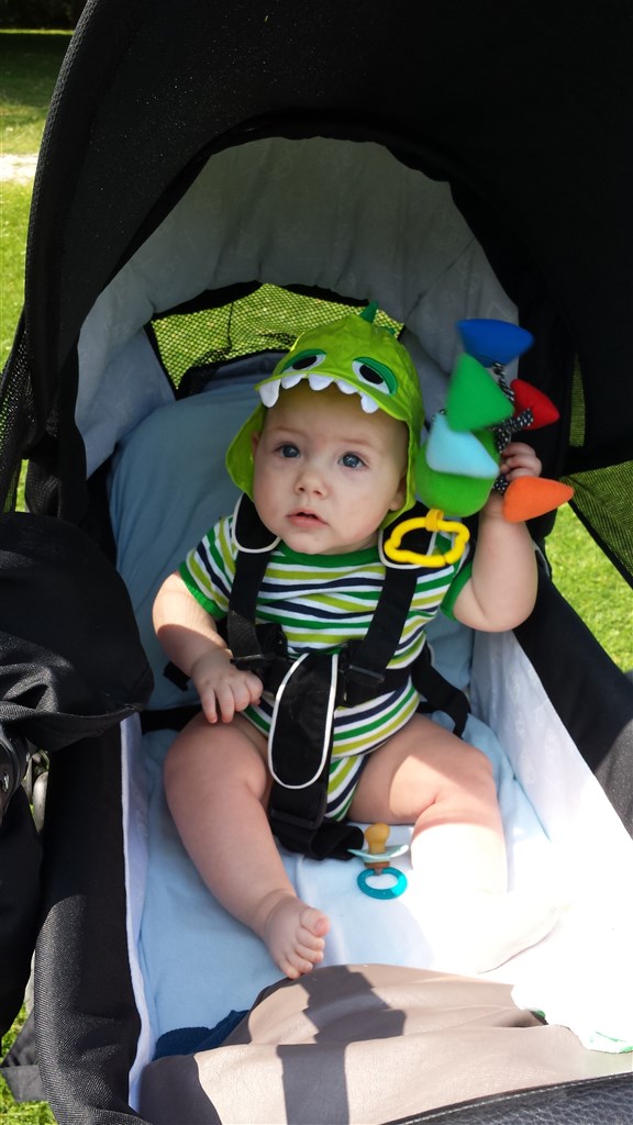 Han er utrolig nysgerrig og kigger rundt på alt omkring ham, og så smiler han til alle og charmer hvem han kan. Han er også helt vild med at hoppe, så vi har haft ham i en hoppegynge i kort tid ude hos mine forældre.