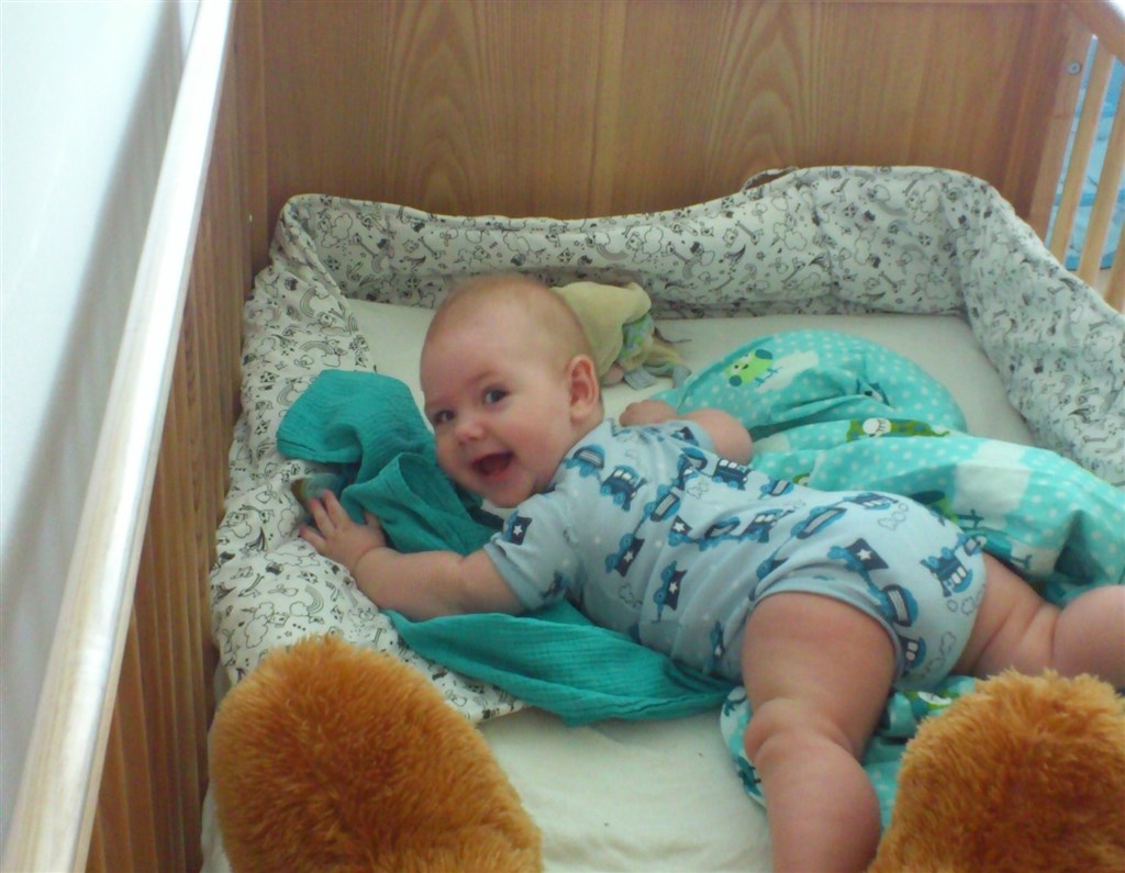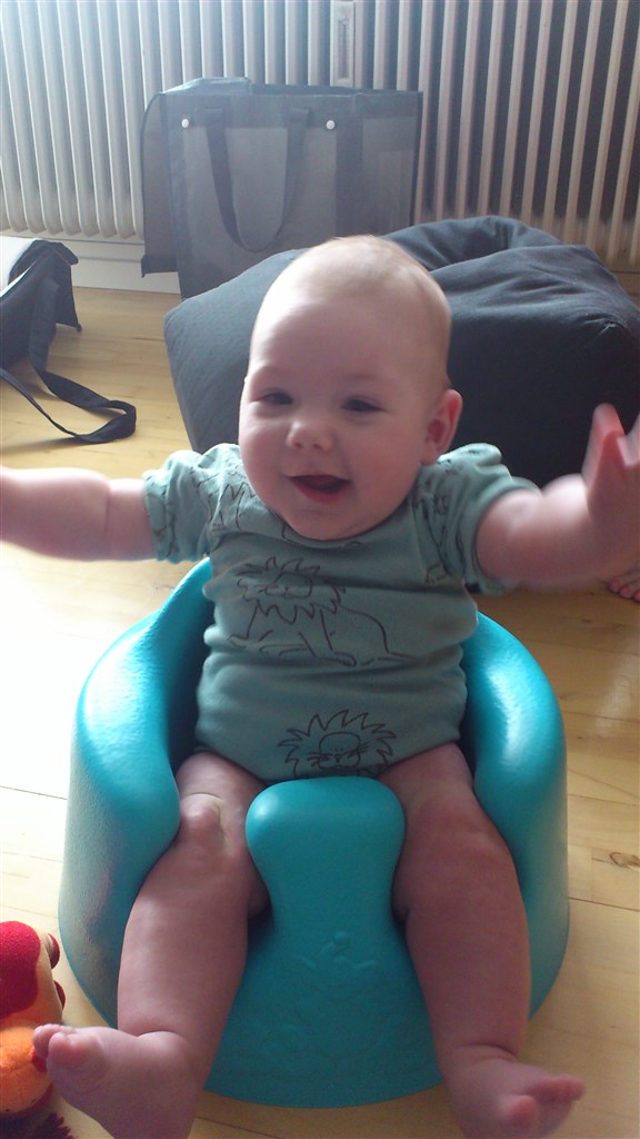 Her går det også godt, der er fuld fart over feltet det meste af tiden. Magnus er rigtig god motorisk. Han vender sig fra ryg til mave uden problemer, dog ikke helt så let den anden vej. Han kan dreje rundt om sig selv ved at bruge benene når han ligger på maven og så er han også begyndt at skubbe sig lidt bagud. Han kan ikke sidde helt selv, men sagtens i højtol og mellem mine ben så jeg kan støtte ham lidt hvis han får for meget overbalance.