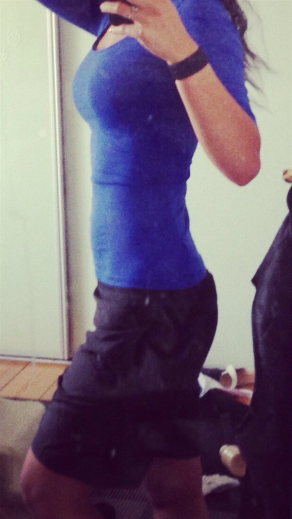 Jeg har ikke taget på endnu, men maven buler og en begyndende baby-hule er tydelig at se