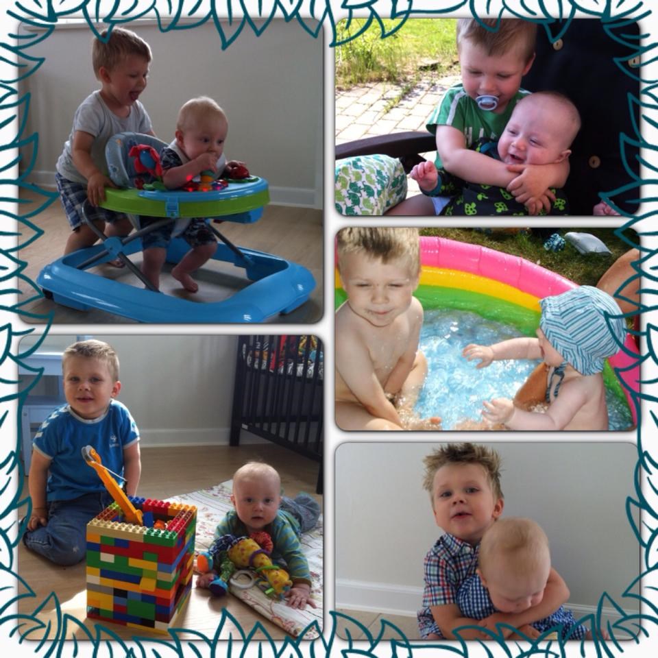 der er lige præcis 24 mdr og 24 dage imellem mine, og vi har ladet storebror være med i alt det han ville lige fra starten af. Han holdte lillebror da vi stadig var på sygehuset, og han har hjulpet meget med at skifte ble, bade, give tøj på osv.