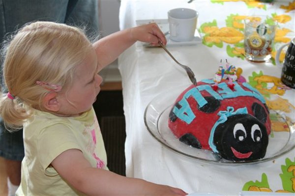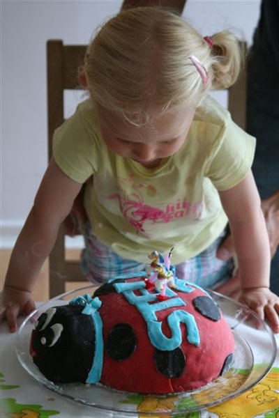 Kagen kan derefter pyntes og børstes af med en lille pensel (Bogstaver eller andet pynt lavet af Sugarpaste kan sættes fast med lidt vand på bagsiden) og stå til dagen efter - Klar til servering