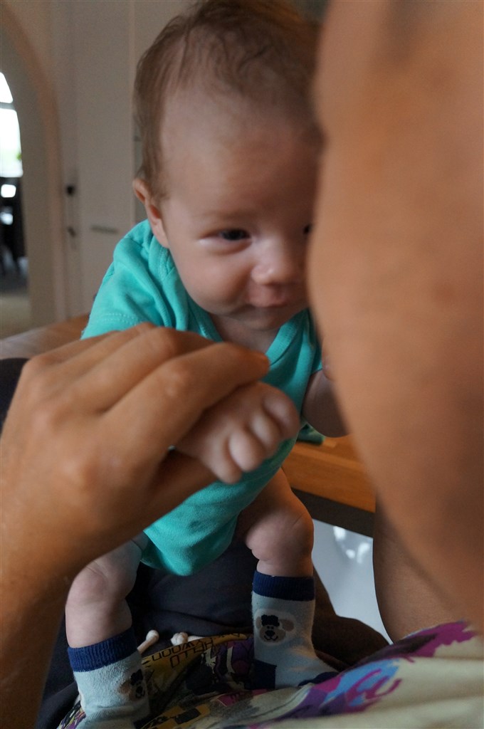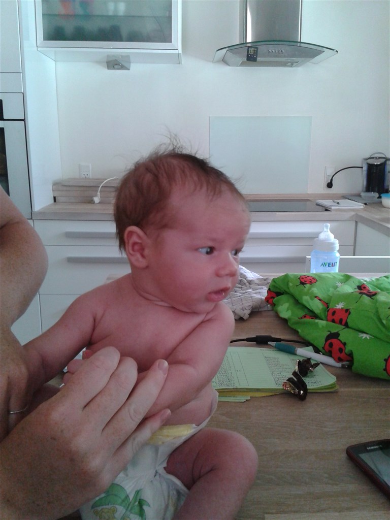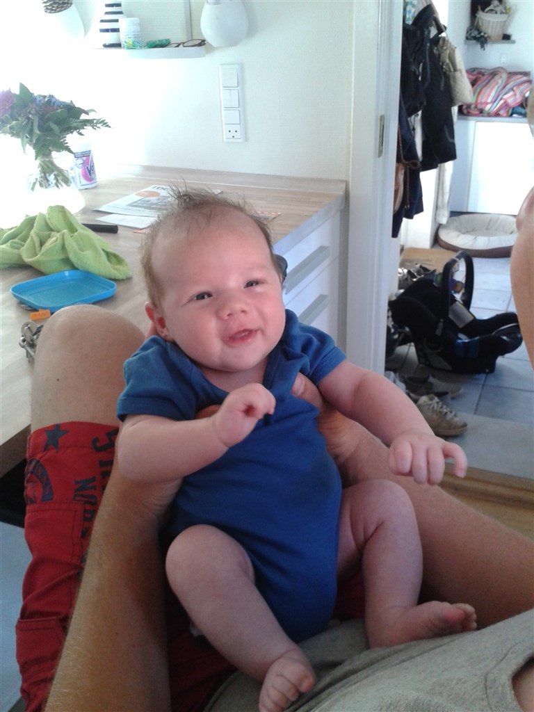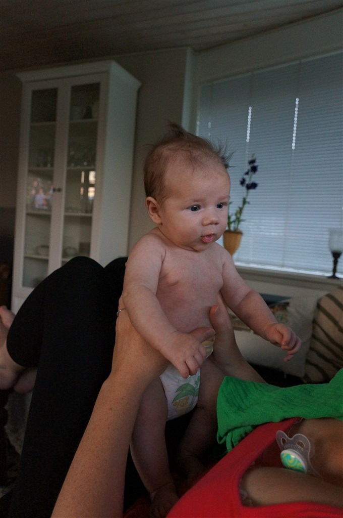 Han er så glad og vaks. Han kan holde sit hoved SÅ flot, både når han ligger på maven men også når han sidder. Han elsker at stå på sine ben. Aske er også begyndt at pludre - så vi har os nogle gevaldige samtaler herhjemme