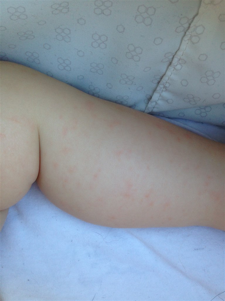 De er på ben, i nakken og under bleen? De var der da vi stod op, men synes der er kommet flere og de er tydeligere nu hvor hun sover lur? Hun har aldrig haft varme knopper før? Har lige mærket på hendes ryg og hun sveder ikke?