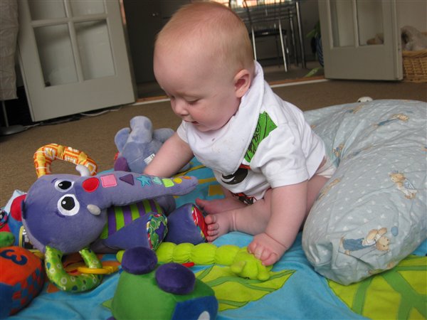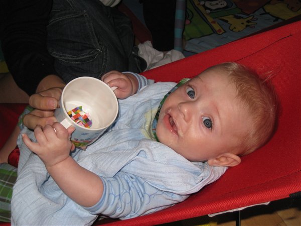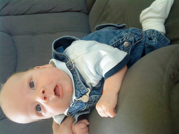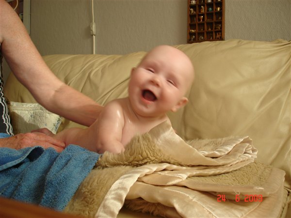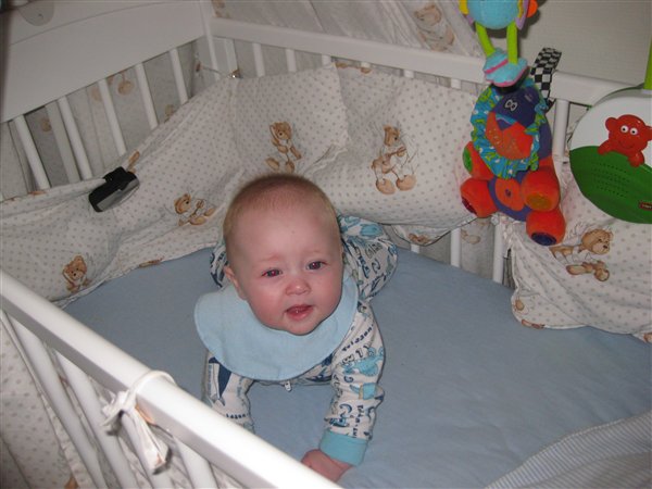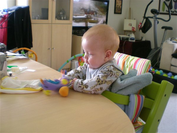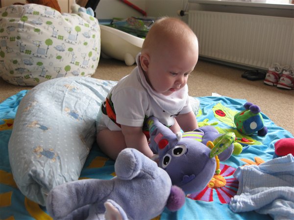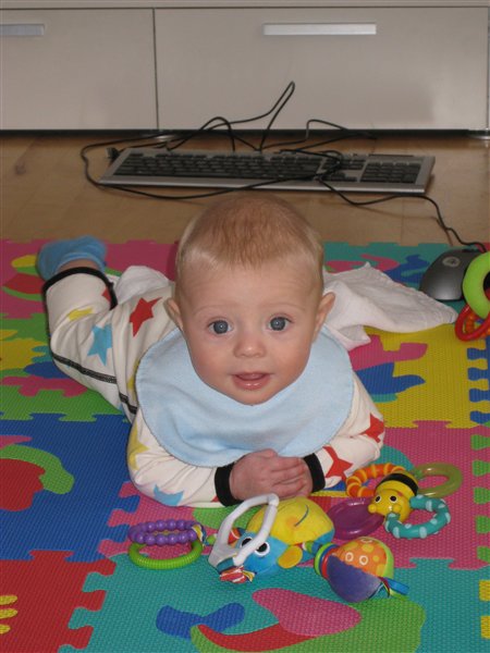 Min Linus er født samme dag som Dianas Lucas og der er bare så stor forskel på de 2. Linus er begyndt at holde nakken rank og kan nu stå og sidde oprejst med støtte. Sidde så flot alene som Lucas gør kan han slet ikke og ligge på maven er højst 2-5 min. ad gangen, ellers bliver han en lille brok mås