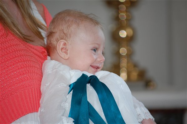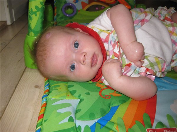 Der er fuld gang i udviklingen fysisk i denne måned. Linus er endelig begyndt at ligge rigtigt med armene, når han ligger på mavsen og både mave og ben musklerne bliver der arbejdet godt med. Så er han også blevet døbt og i forgårs startede vi med lidt grød det synes han var fantastisk