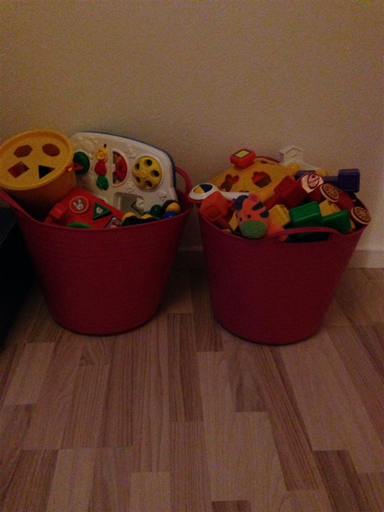 Og så købt 4 lilla kurve og sat i nogle af hulderne til småtings legetøj og resten af hylder er brugt til det store legetøj.