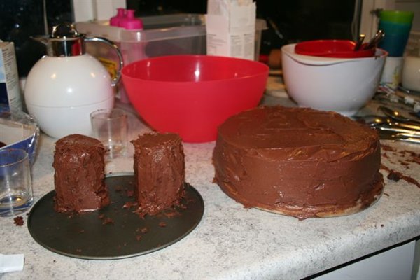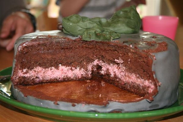 Kagen er lavet af rugbrødsbunde m. appelsinsaft/skal, jordbærmousse, chokoladecreme m. dobbeltchokolade (1/4 fløde + 200 mørk chokolade), smurt op med nutella smørcreme og pyntet med mmf. MUMS!