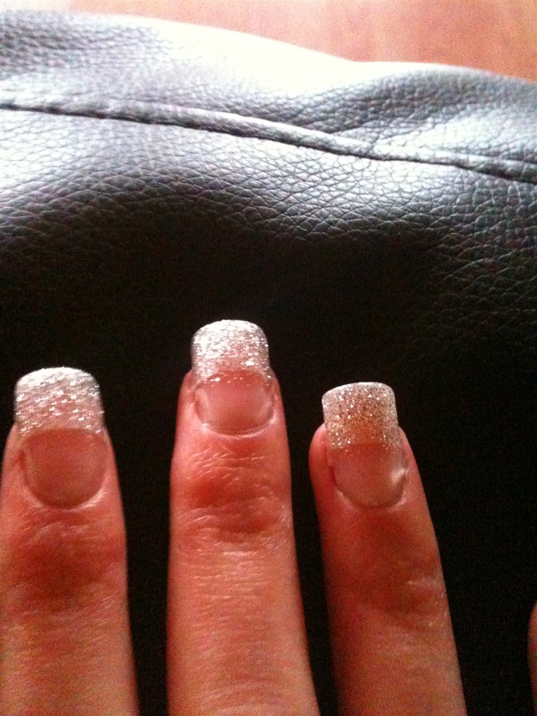 Det har jeg også gjort, har filet neglen, sat tipperne på, filet tipperne, så har jeg brugt dehydrator og så primer, base gel, builder gel dyppet i glimmer, endnu et lag builder, tørt af med gel residue, så filet neglen, derefter filet med en white sanding block, og så top coat