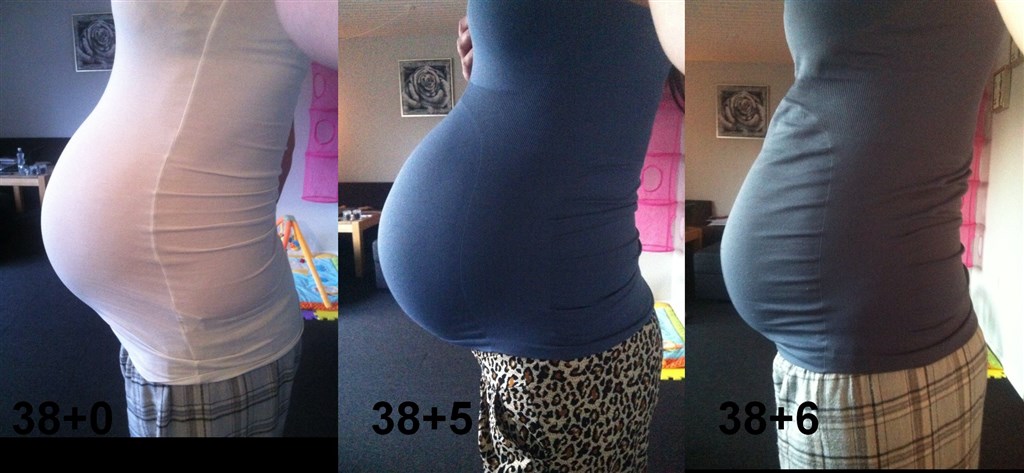 . Jeg har billede fra 38+0, 38+5, hvor i også kan se den er sunket en del, og så fra dagen efter min fødsel, altså hvor jeg skulle ha været 38+6