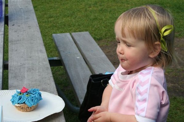 Muffins er med marcipan, chokoladestykker og skovbær, men desværre var de ikke helt så gode, som de lyder. Alt for klæge i det og for lidt smag, men de faldt alligevel i god jord ved bl.a. Nanna, der udbrød et stort MMMM, da hun smagte på den. De er smurt med cream cheese frosting og al pynten er mmf.