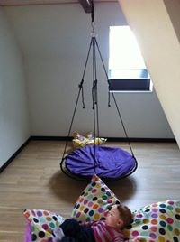 Vi har fået lov at teste den originale sansegynge i noget tid nu. Vi har hængt den op på vores førstesal da spærrene er fri og Vigga vil, når hun bliver lidt ældre, få lege/hygge hjørne der. Gyngen kan let indstilles i forskellige højder, der gør at den kan bruges til forskellige aldersgrupper. Vigga er kun 7 Måneder så vi har valgt, at hænge gyngen lavt, så der ikke er langt til gulvet, hvis hun skulle trille ud over siden og så hun samtidig selv kan kravle op på den, når vi leger på 1 sal. Gyngen er godkendt til 100kg så mor eller far kan også tage en tur på den sammen med barnet. Den er netop kommet i en flot knald rød farve. Man kan få noget "ekstra udstyr" til gyngen, heriblandt et telt til at trække uden om den, så gyngen bliver til en hule og den er helt klart skrevet på ønskesedlen her hjemme. Det kan ses på Sansegynge.dk