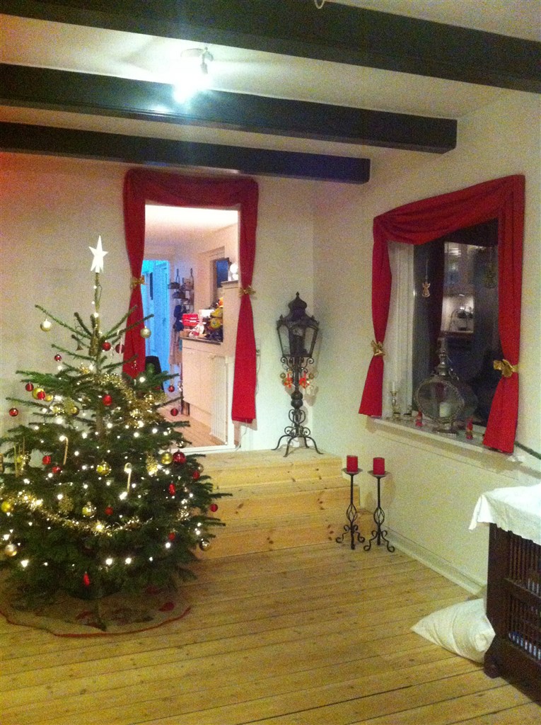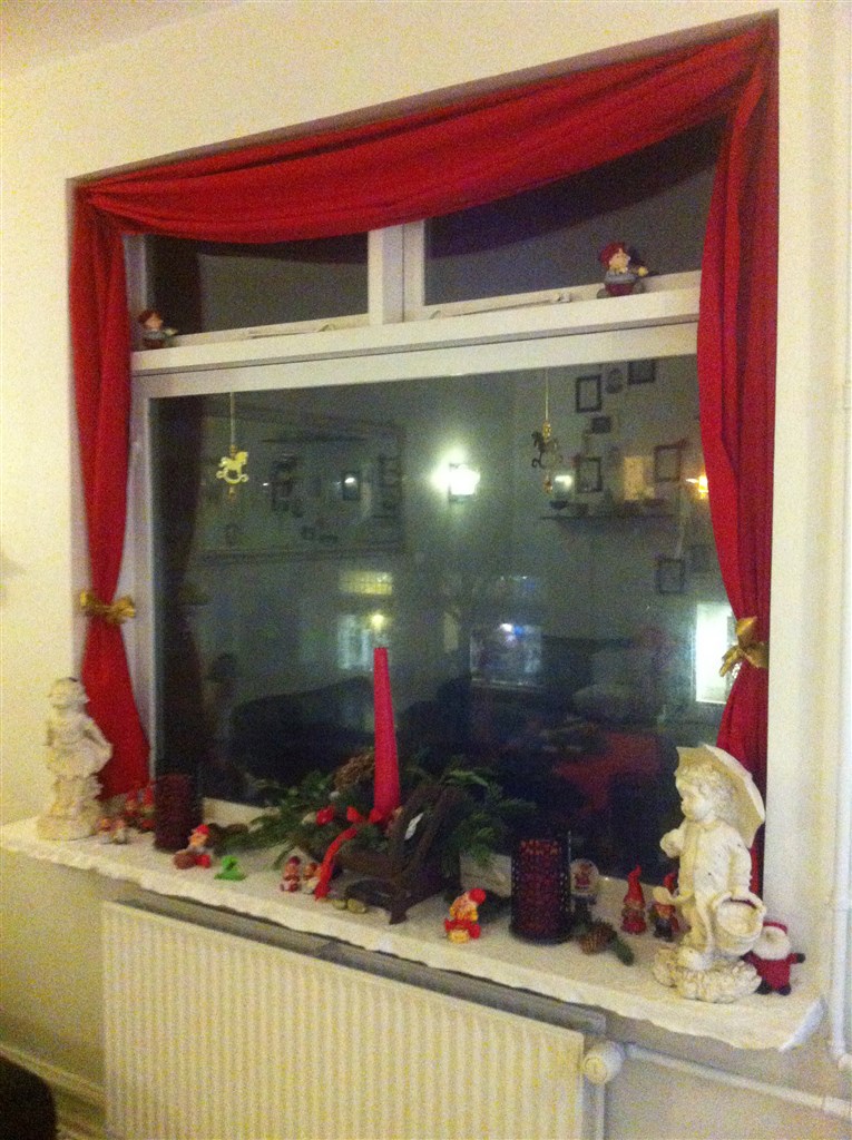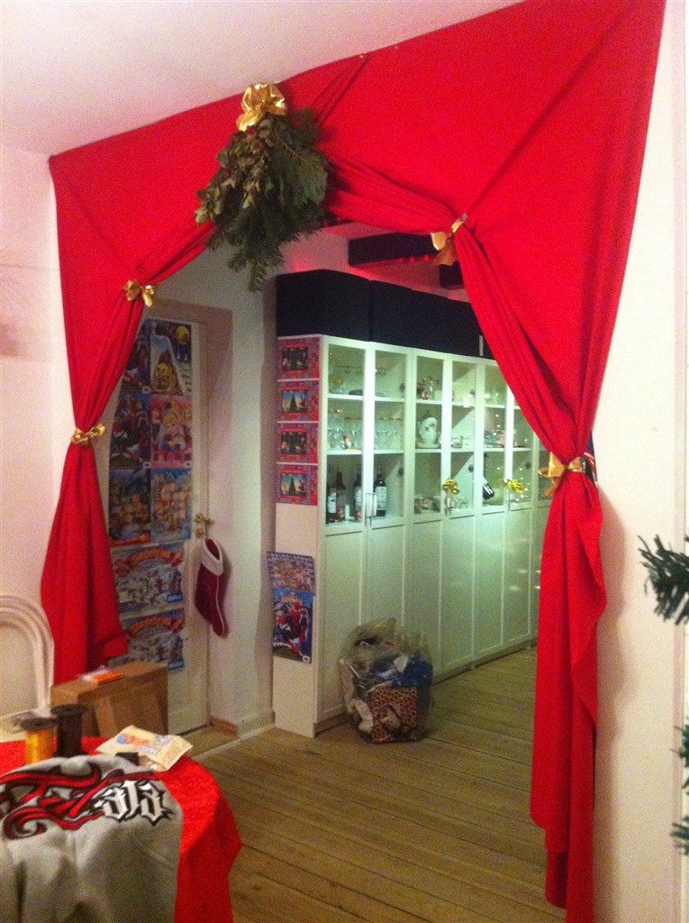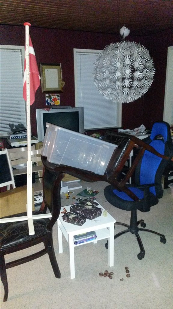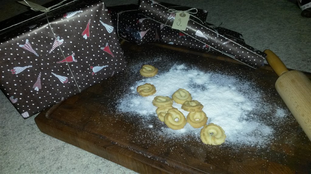 Billederne med møbler i stakke og småkager med mel og sukker, det er når drillenissen har været her om søndagen med gaver, så laver han altid uorden i det hele