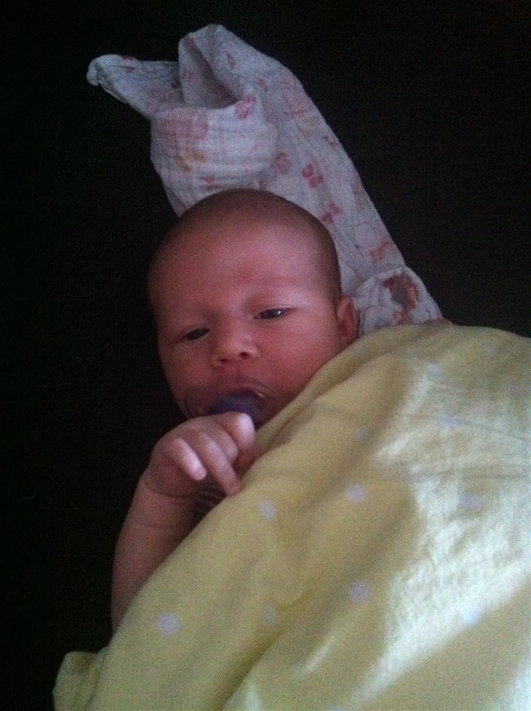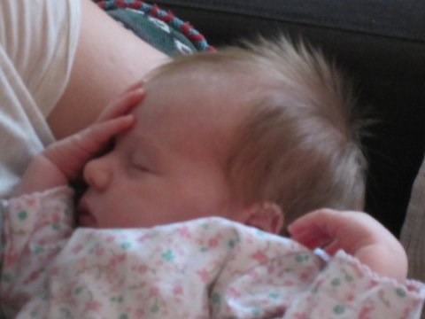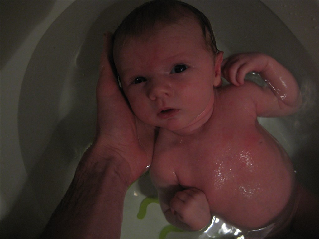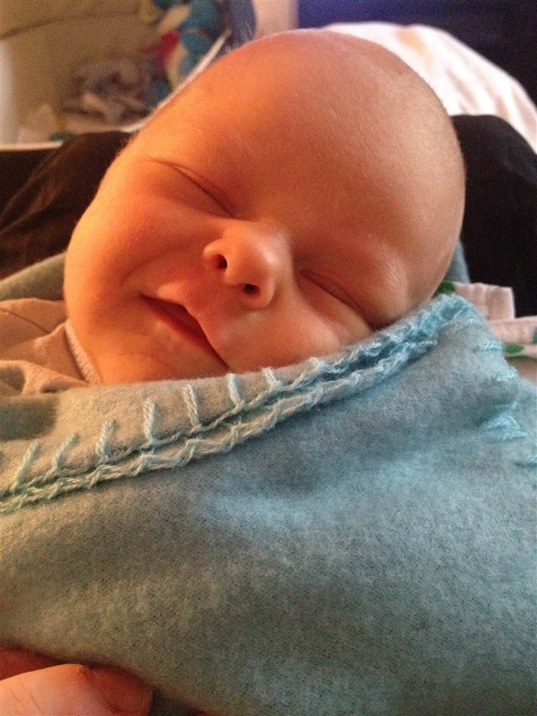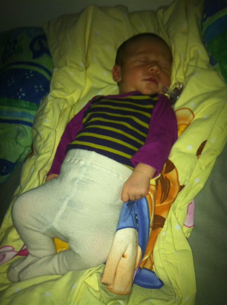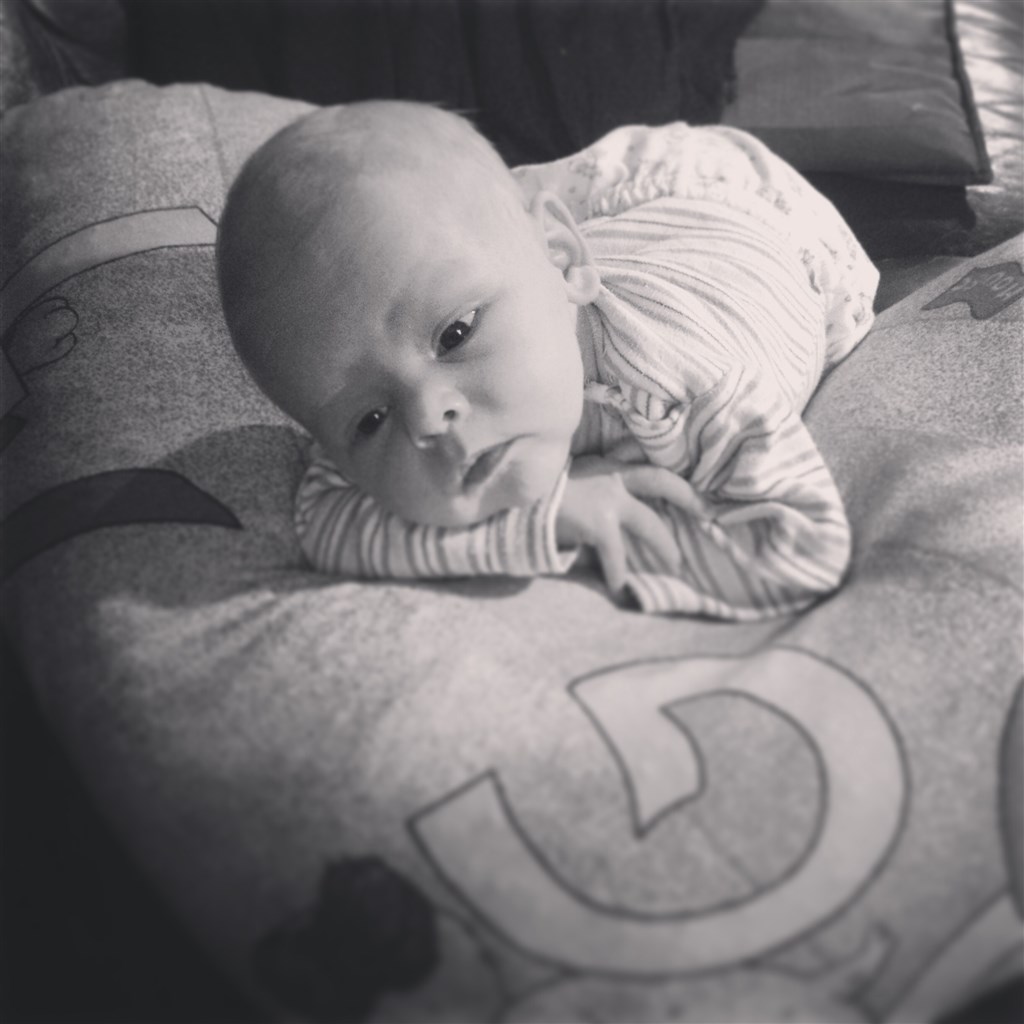 Han kan ligge længe på maven og holde hovedet oppe og han er begyndt at kigge meget interesseret på mor og far