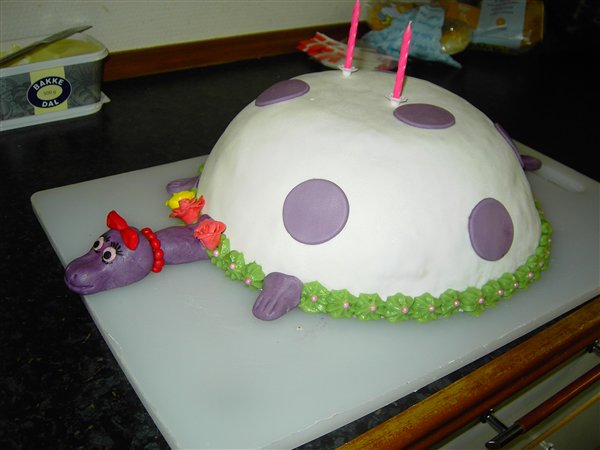 Og så var der selvfølgelig lavet kage. Jeg havde tænkt mig at lave en mariehøne, men ombestemte mig og ville lave dino´er/drager. Den første skulle have været lyserød med lyselilla prikker, men den pink der følger med i sættet fra CCS farver RIGTIG meget - så den endte med at være rød, og så passede sorte prikker bedre - så lidt marie er der over den. Den anden er hvid med de lilla prikker. Den mangler spidserne på ryggen, men kunne ikke få dem tørret, så de blev stive:
