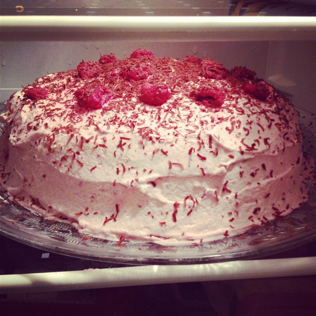 og ja, så lægger du bare lagkagen sammen. Jeg plejer at lægge et lag creme og så jordbær ovenpå, sådan at cremen og jordbærene ikke er blandet sammen indeN