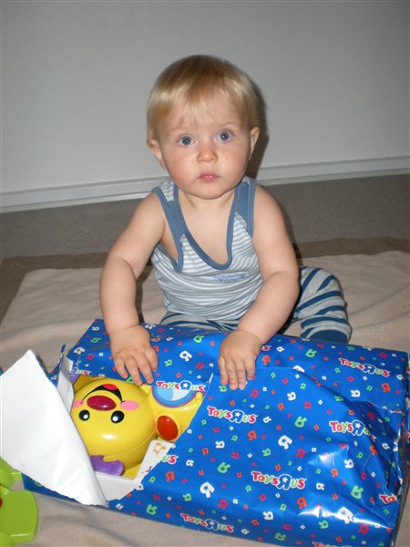og han fik en masse fine gaver, som han allerede har leget lidt med, er så et par ting hvor der lige skal gå en måned el 2 før han kan få det.