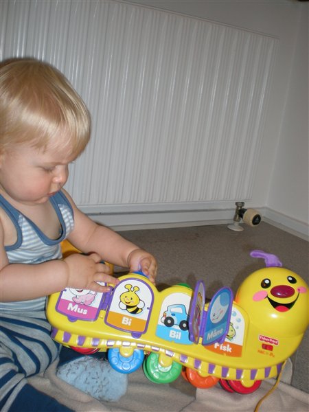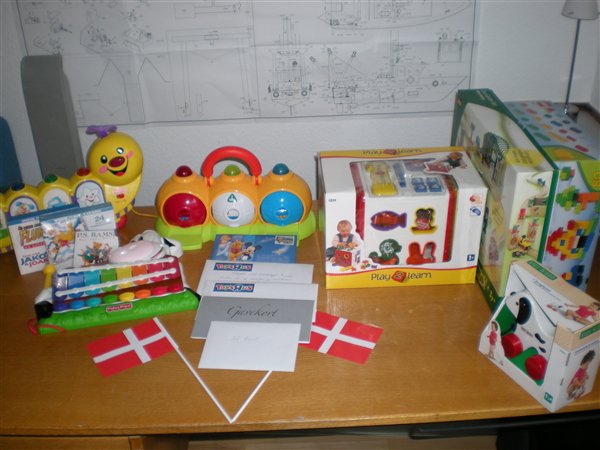 Han har fået nogle gavekort, penge, duplo, brio togbane, 4 cder med hans ynglings børne musik, xylofon, en trækhund, en garage med brandbil,politibil og ambulance hvor der så kommer udrykning i når han åbner garagen, en kålorm som kan en hel masse og en kasse med klodser og ur og telefon i, et sølvkors, og idag var vi nede og bruge gavekortet til ønskebørn hvor vi købte et aktivitets bord hvor der en en masse på, rigtig smart. Her en af dagene skal vi ud og bruge resten af gavekortene på en cykel til ham